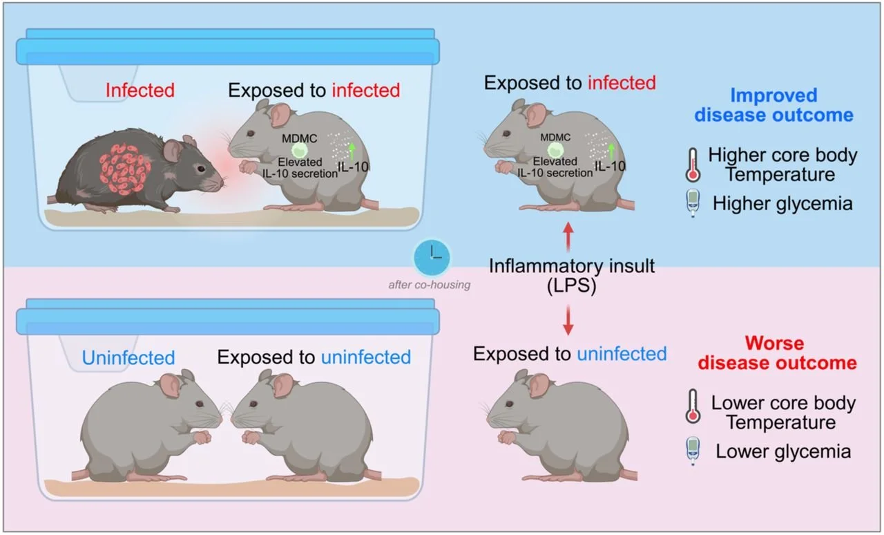 This exposure to infected cage-mates establishes a primed immune state that enhances physiological resilience. Notably, exposed mice were better protected against a subsequent sublethal lipopolysaccharide (LPS) inflammatory challenge. Mechanistically, this protection was mediated by increased IL-10 production from myeloid cells. Blocking IL-10 signaling eliminated the exposure-induced protection, demonstrating a key role for this anti-inflammatory pathway.